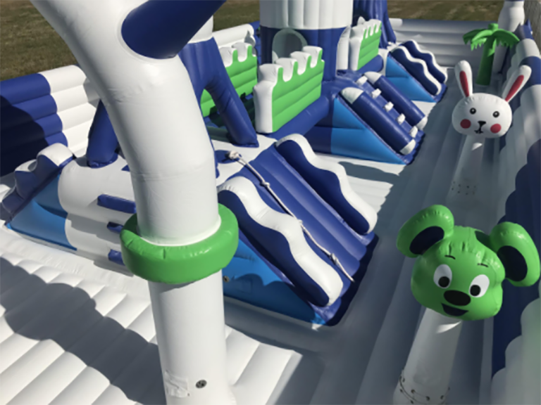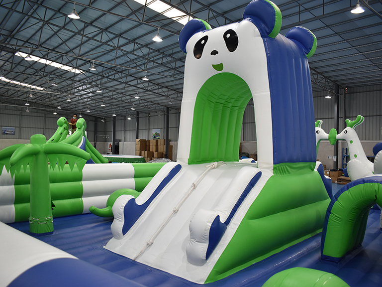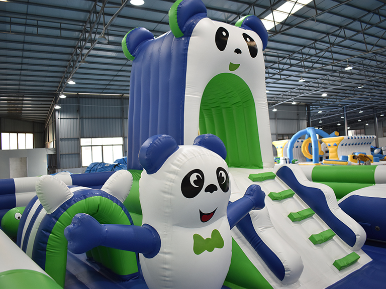 It just like an inflatable zoo. Before entering the castle, you can see there are two giraffes at the entrance and a giant panda in the middle of the inflatable fun city. When entering the giant castle, you can see hamster, panda, tunnel, obstacles and a bigger pander slide. Kids can sit on the hamster body, hug the panda, cross the tunnel, climb in the body of the bigger panda and slide down. They also can just jump together with their friends on the bouncy area.