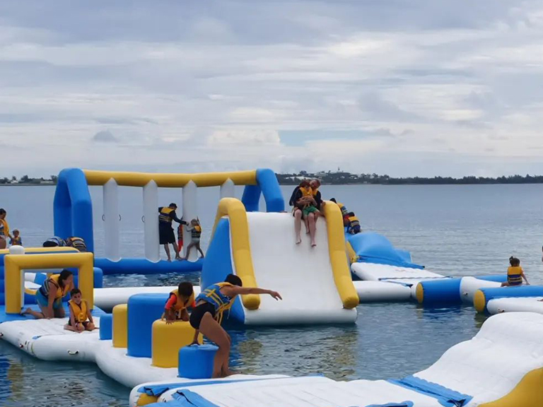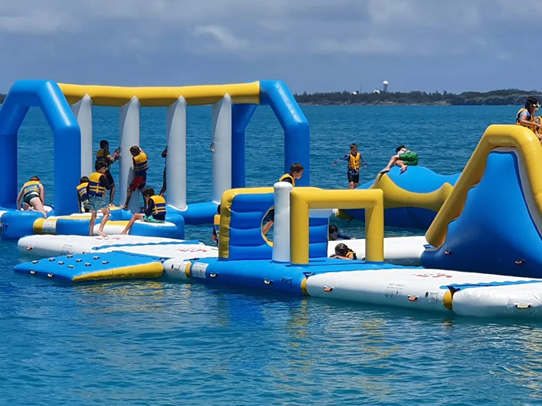 This a 60 people capacity inflatable water park installed in a watersports center in Bermuda.This customer got the payback in one week. This park is small. But with different challenging water obstacles, it’s also full of fun for families, friends gathering, team building and camps. If your budget is limited at the beginning, this small inflatable water park is also a good choice to begin with.