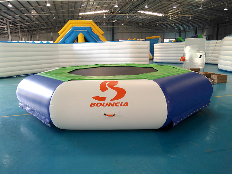 It’s slightly adjusted according to our top-rated park100 standard combination and replaced some items that the customer do not like. And changed our standard colors to blue, green and white combination. Besides Bouncia logo, our customer’s logos are also printed on the water playground items.