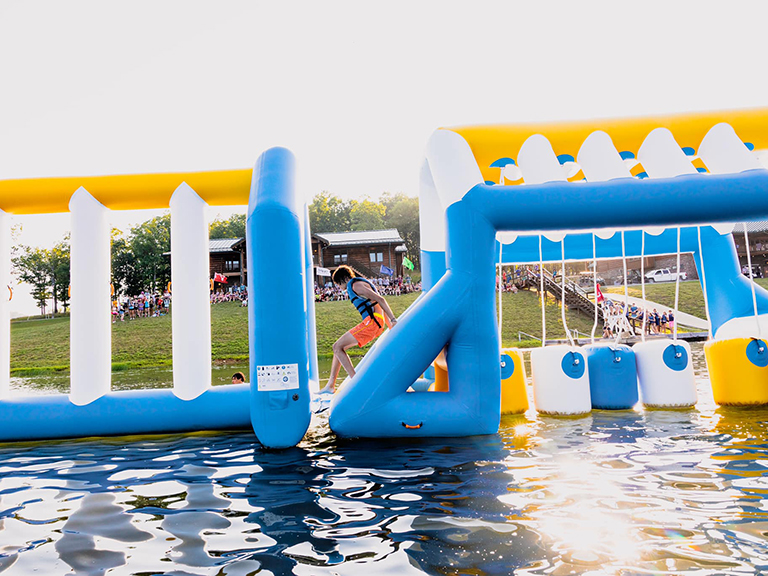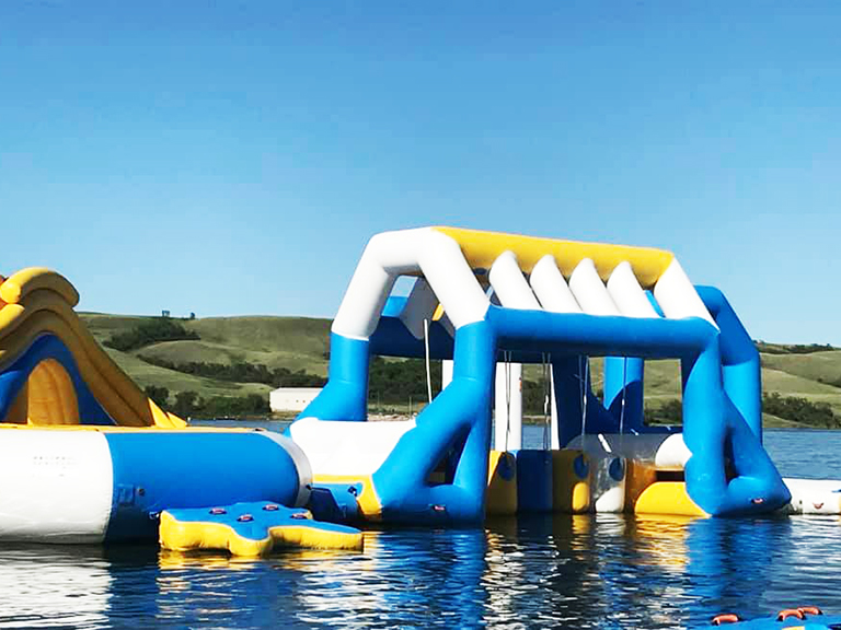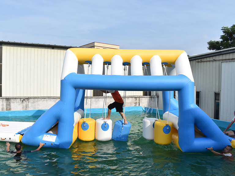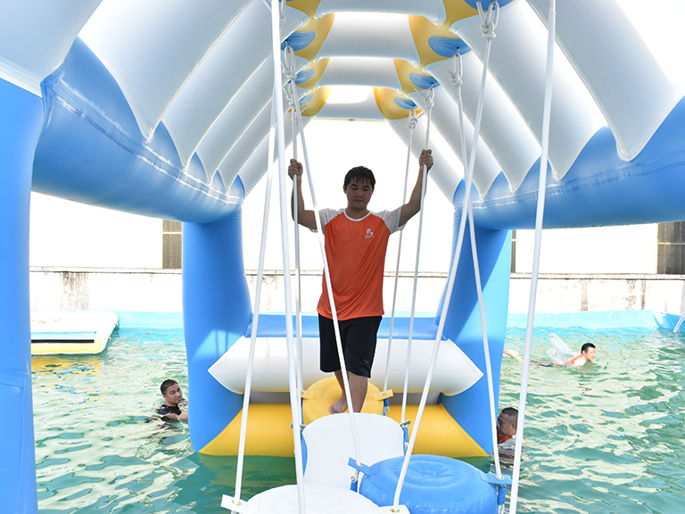 Challenge yourself by trying to cross the inflatable water stumps as quickly as you can. Those floating stumps are very wobbly. Especially for adults. It’s good for both shallow and deep water.