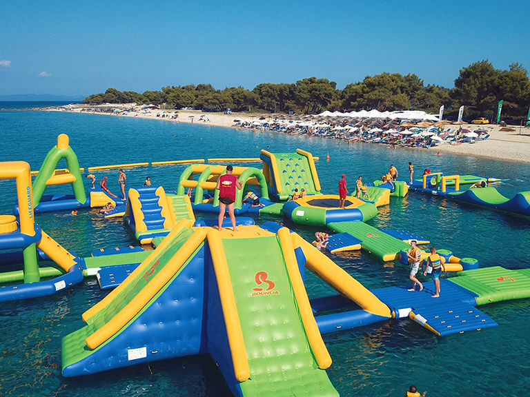 Otro parque acuático marino de Bouncia instalado en el mar Egeo, Grecia. El sistema de doble conexión Bouncia Durable hizo que el parque marino fuera muy duradero y estable en las tormentas.