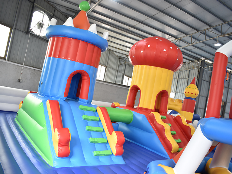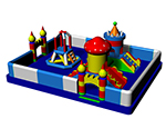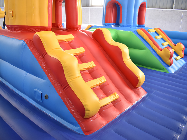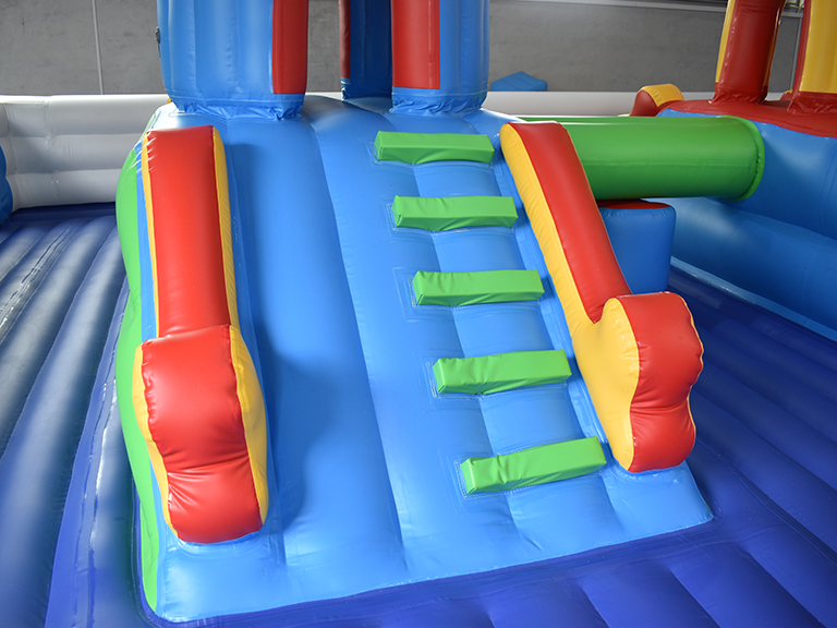 This is a colorful air sealed inflatable water castle with maximum 15 capacity for kids between 3 to 6 years old. You can use it both with water in summer and dry in other seasons. The bright red, yellow, green and blue color makes the park very attractive for kids. It has 2 slides with castle ceilings and a guard tower. Unlike Bouncia other air sealed inflatable bouncy castles, this castle is a customized item and it has two entrances and the guard tower. We can remove the guard tower to make the bouncy space bigger.