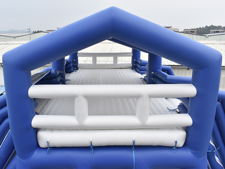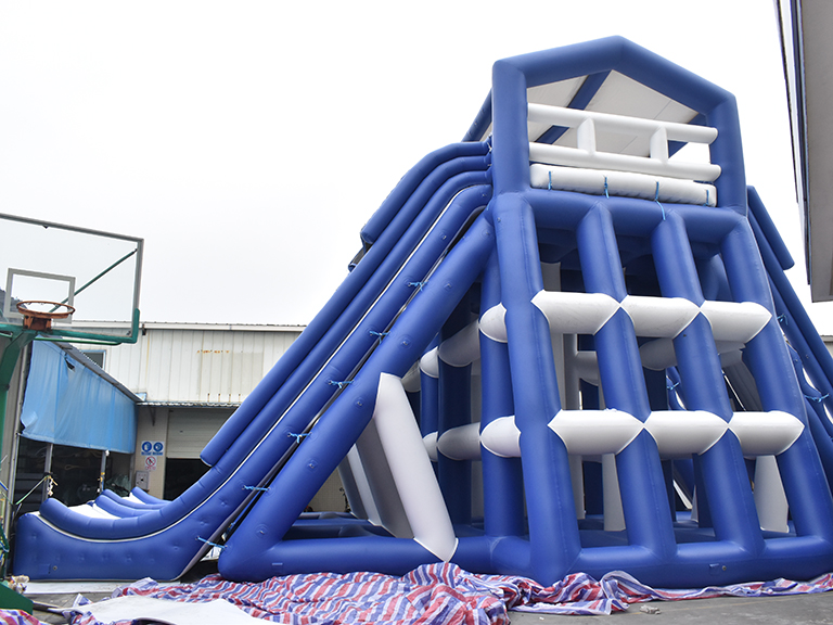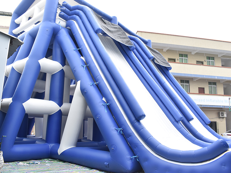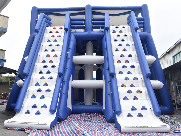 As you can tell from its name, the Giant Floating Double Slide is a giant inflatable water game with 2 extra long slide. It is 17 meters long, 13 meters wide and 10 meters high. The Giant Floating Double Slide has a 6.9 meters high platform, which can let visitors achieve the tricks of diving, jumping and so on. You might want to ask that how visitors can go up this Giant Floating Double Slide. Behind the two slides are two ladders that visitors can climb up to the platform of the slide.