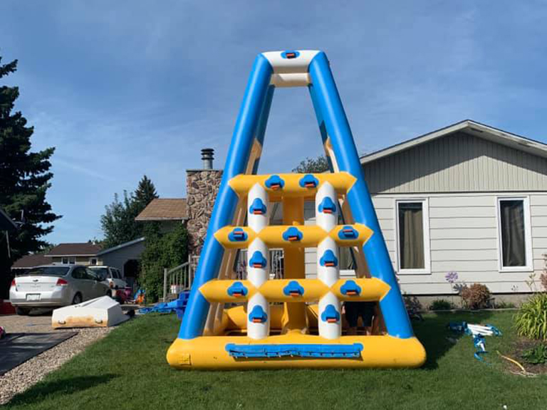 This 70-people inflatable water park located in Canada with the size of 44 meter long and 32 meter wide. There are jumping blobs in this water park and the minimum water depth of the water area is 3 meter deep.