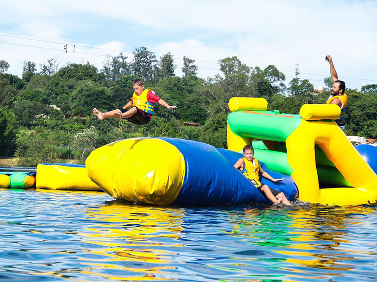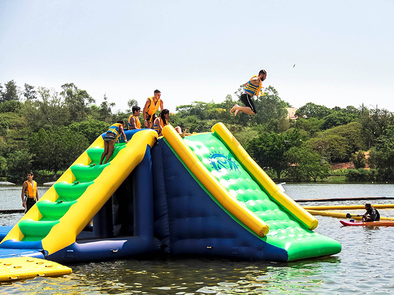 This is an Bouncia inflatable water park project in Brazil. It is installed on a lake and can accommodate up to 75 people. The inflatable water park consists of multiple water obstacles, where you can relax with your friends or family, and we believe it will bring you a different experience.