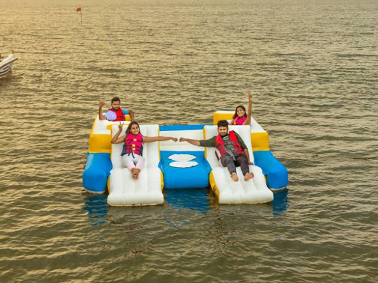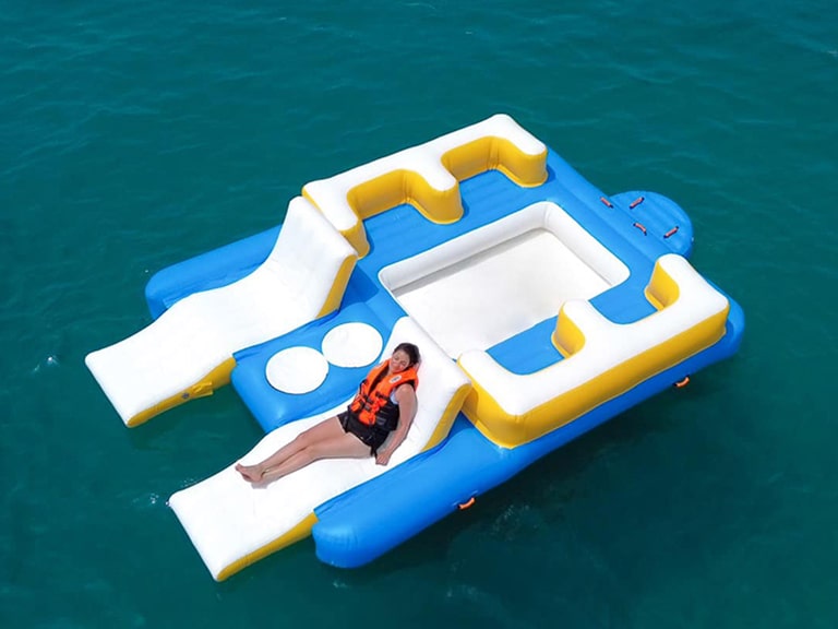 Relax in style with this inflatable water lounge island. Perfect for lakes, oceans, or yachts. Includes seats, backrests, and a sun-friendly design.