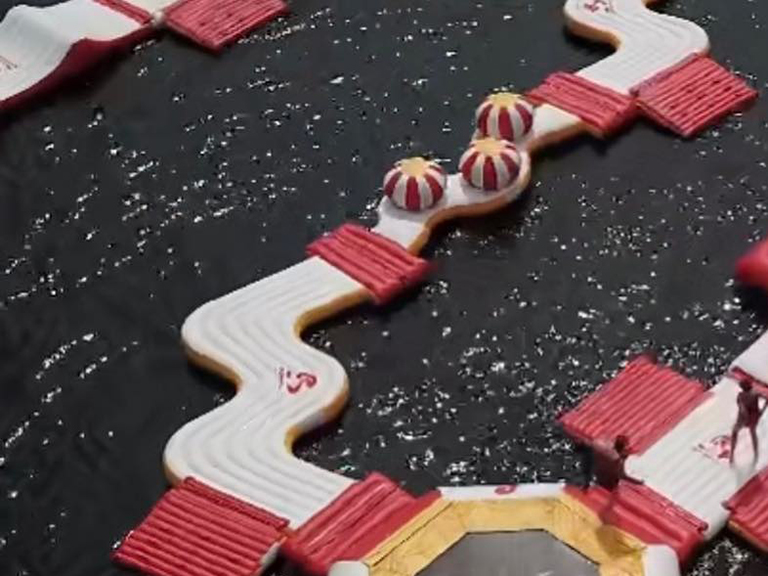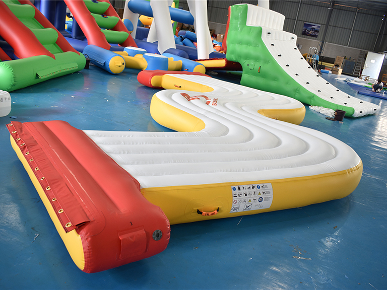 The price of this grandblue inflatable water park in France is less than USD60000. The maximum capacity at the same time is 160 people. For a better playing experience for your guests and safer operation, the recommended capacity is 110 people.This park owner changed the original color scheme yellow/white/sky blue to yellow/white/red. It looks more visible on the water.