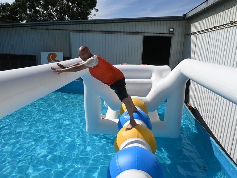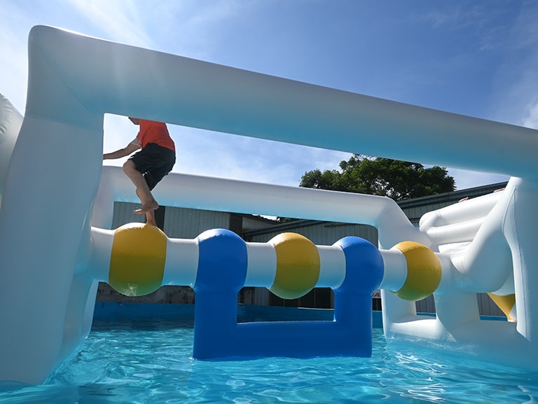 高さ9mのこのログウォークは、あらゆるインフレータブルウォーター障害物にダイナミックバランス機能を追加します。ユーザーは、入口のラダーを登った後、動きに合わせてわずかに移動する凸凹したログの上を歩き、出口のラダーを降ります。オプションで両側に手すりを取り付けることで、湖、海、ラグーン、リゾートのプールなど、様々な場所に設置でき、様々なスキルレベルのプレイヤーが水上ゲームを楽しめます。