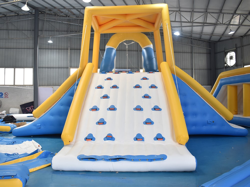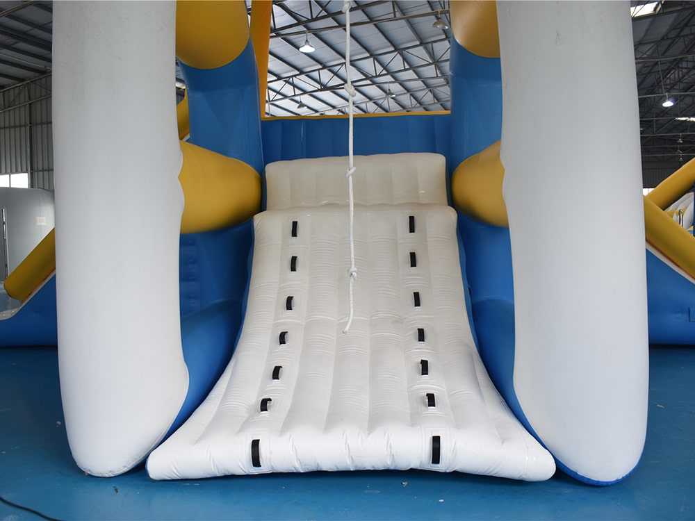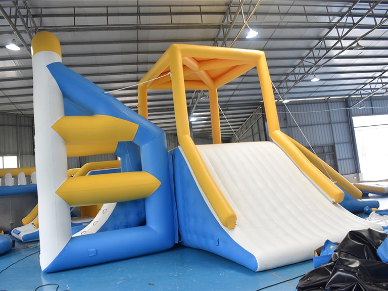 Explore Bouncia's inflatable swing slide tower for water parks. This unique climbing and sliding inflatable brings swinging fun and challenges to your floating playground. Custom designs available!