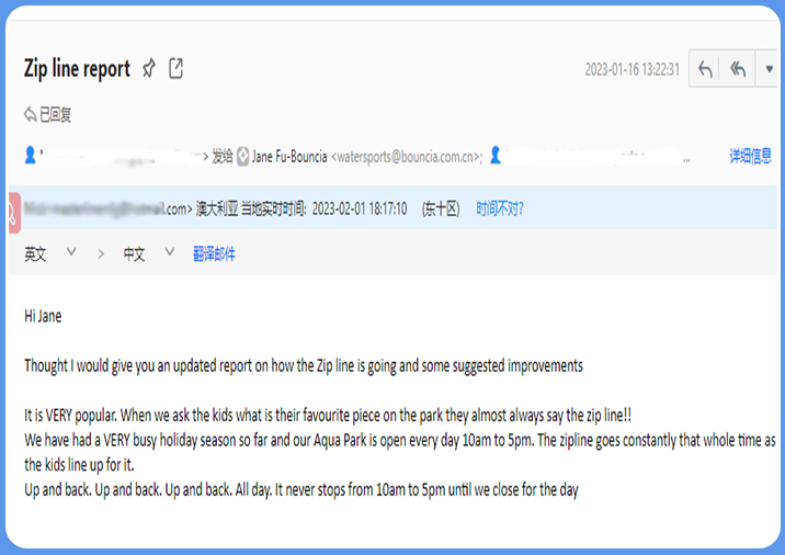 The good news is we designed and made the sample successfully in the year 2022. This inflatable water zipline is good for both adults and kids. It can be connected with other water obstacles at the end of the park or set up as a stand-alone item. It does not need extra life guards to supervise.
