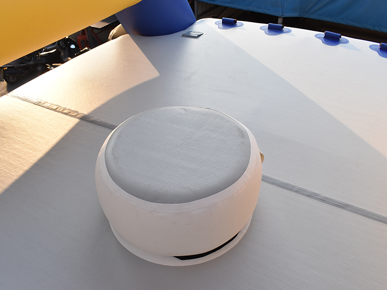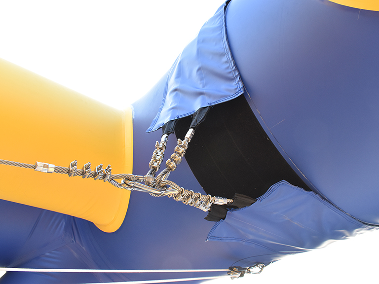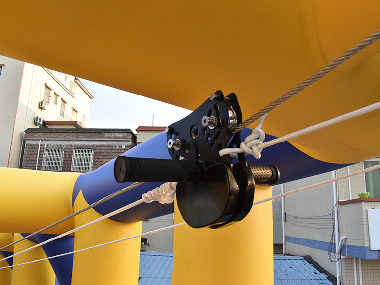 Zipline courses are very popular in the free public park or tree surfing adventures on the land. For years, we were thinking to design an inflatable Zipline for water park. Imaging the feeling of grabbing the handle and glide to the end of the zipline above the lake or sea. Then make a splash into the water.